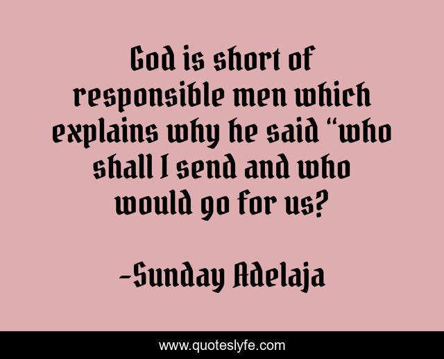This page presents the quote "God is short of responsible men which explains why he said “who shall I send and who would go for us?". Author of this quote is Sunday Adelaja. This quote is about men, responsible, send,.