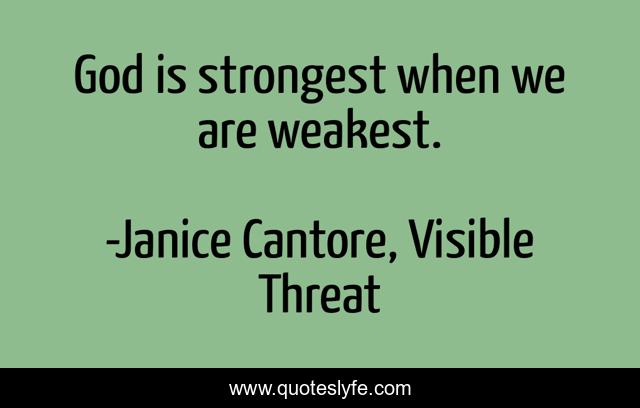 This page presents the quote "God is strongest when we are weakest.". Author of this quote is Janice Cantore, Visible Threat. This quote is about god, strong, weak, christianity,.