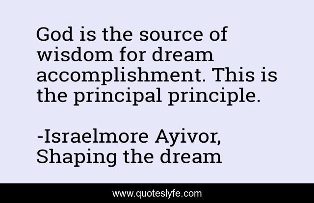 This page presents the quote "God is the source of wisdom for dream accomplishment. This is the principal principle.". Author of this quote is Israelmore Ayivor, Shaping the dream. This quote is about food-for-thought, accomplish, the-fear-of-god, god, accomplishment, principles, wisdom, source, principle,.