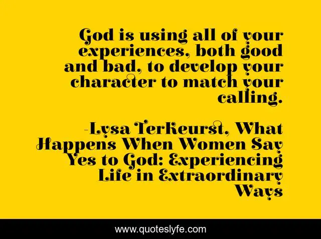 This page presents the quote "God is using all of your experiences, both good and bad, to develop your character to match your calling.". Author of this quote is Lysa TerKeurst, What Happens When Women Say Yes to God: Experiencing Life in Extraordinary Ways. This quote is about god, life, calling, experiences, christianity,.