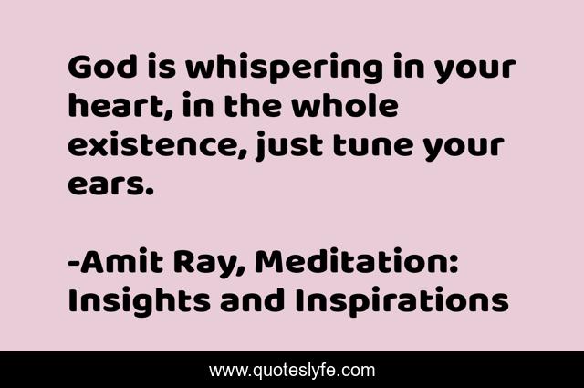 This page presents the quote "God is whispering in your heart, in the whole existence, just tune your ears.". Author of this quote is Amit Ray, Meditation: Insights and Inspirations. This quote is about spiritual-growth, spiritual, motivational, meditations, god, mediation, confidence, spirituality, optimistic,.
