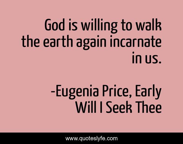 This page presents the quote "God is willing to walk the earth again incarnate in us.". Author of this quote is Eugenia Price, Early Will I Seek Thee. This quote is about christianity, spiritual-life, god-s-love, truth, grace,.