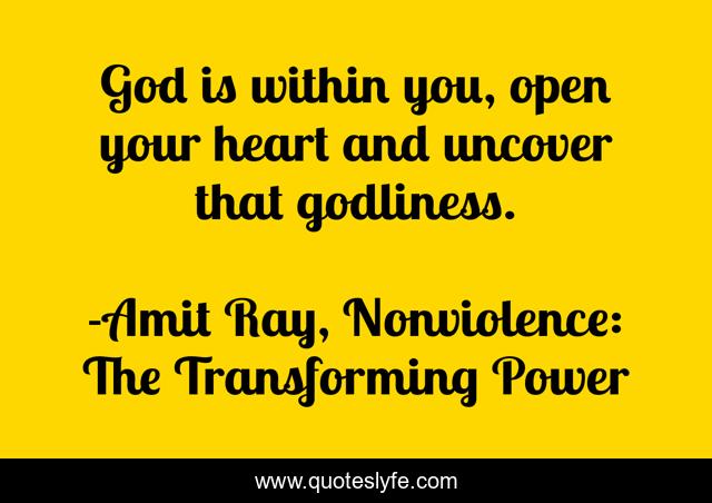 This page presents the quote "God is within you, open your heart and uncover that godliness.". Author of this quote is Amit Ray, Nonviolence: The Transforming Power. This quote is about nonviolence, spiritual-wisdom, heart, god, religion-and-philosophy, spirituality, spirituality-religion, uncover-your-godliness, joy,.