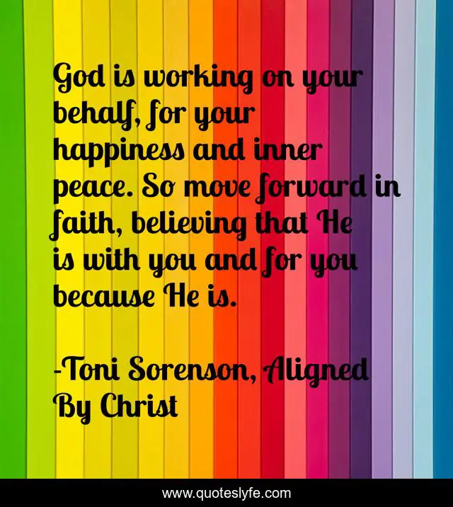 This page presents the quote "God is working on your behalf, for your happiness and inner peace. So move forward in faith, believing that He is with you and for you because He is.". Author of this quote is Toni Sorenson, Aligned By Christ. This quote is about faith, life, love, success, god, peace, happiness, affection, inspiration,.