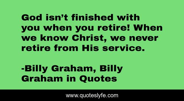 This page presents the quote "God isn’t finished with you when you retire! When we know Christ, we never retire from His service.". Author of this quote is Billy Graham, Billy Graham in Quotes. This quote is about age, billy-graham,.