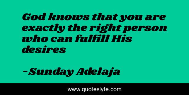 This page presents the quote "God knows that you are exactly the right person who can fulfill His desires". Author of this quote is Sunday Adelaja. This quote is about desire, god-right, calling, person, purpose, fulfill,.