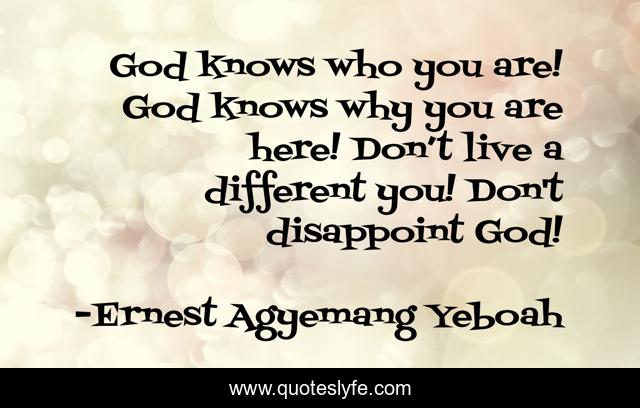 This page presents the quote "God knows who you are! God knows why you are here! Don’t live a different you! Don't disappoint God!". Author of this quote is Ernest Agyemang Yeboah. This quote is about food-for-thought, talent, destiny, be-yourself, gifts, pleasing-god, god-given-gift, god-given-potential, dreams,.