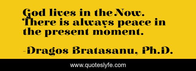 This page presents the quote "God lives in the Now. There is always peace in the present moment.". Author of this quote is Dragos Bratasanu, Ph.D.. This quote is about life, god, peace, present-moment, wisdom, spirituality, live-in-the-moment,.