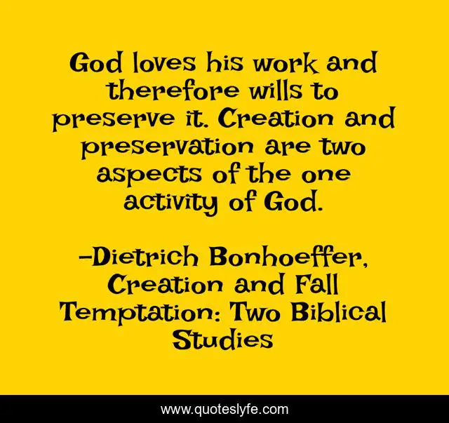 This page presents the quote "God loves his work and therefore wills to preserve it. Creation and preservation are two aspects of the one activity of God.". Author of this quote is Dietrich Bonhoeffer, Creation and Fall Temptation: Two Biblical Studies. This quote is about god, creation, preservation,.