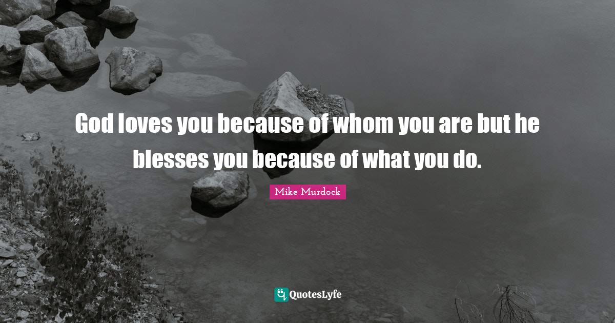 This page presents the quote "God loves you because of whom you are but he blesses you because of what you do.". Author of this quote is Mike Murdock. This quote is about god loves you, love you, god love,.