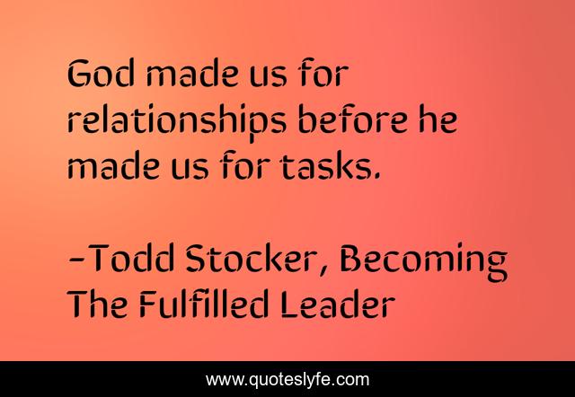 This page presents the quote "God made us for relationships before he made us for tasks.". Author of this quote is Todd Stocker, Becoming The Fulfilled Leader. This quote is about relationships, confidence, tasks, god, motivational, optimistic, inspirational, positive, enthusiasm,.