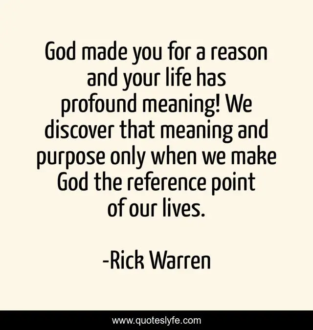This page presents the quote "God made you for a reason and your life has profound meaning! We discover that meaning and purpose only when we make God the reference point of our lives.". Author of this quote is Rick Warren. This quote is about god, meaning, purpose,.