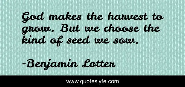 This page presents the quote "God makes the harvest to grow. But we choose the kind of seed we sow.". Author of this quote is Benjamin Lotter. This quote is about faith, responsibility,.