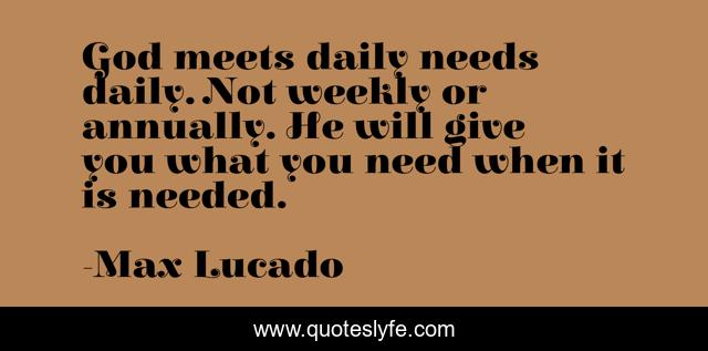 This page presents the quote "God meets daily needs daily. Not weekly or annually. He will give you what you need when it is needed.". Author of this quote is Max Lucado. This quote is about need, daily,.