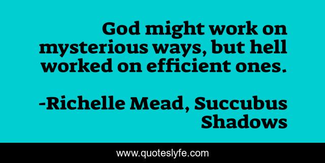 This page presents the quote "God might work on mysterious ways, but hell worked on efficient ones.". Author of this quote is Richelle Mead, Succubus Shadows. This quote is about god, georgina-kincaid, hell,.