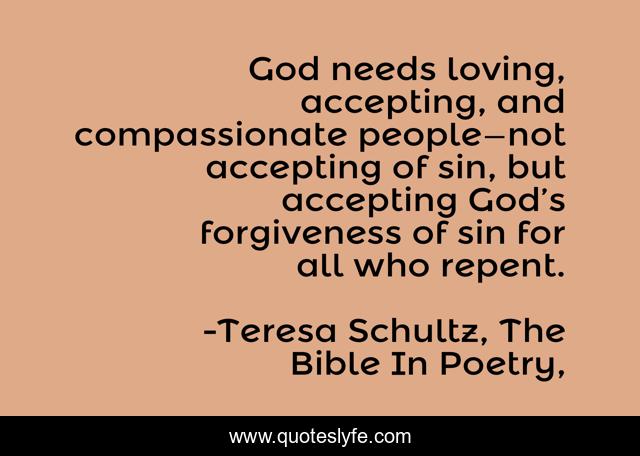 This page presents the quote "God needs loving, accepting, and compassionate people—not accepting of sin, but accepting God’s forgiveness of sin for all who repent.". Author of this quote is Teresa Schultz, The Bible In Poetry,. This quote is about compassionate, god, repentance, accepting, forgiveness, sin, loving,.