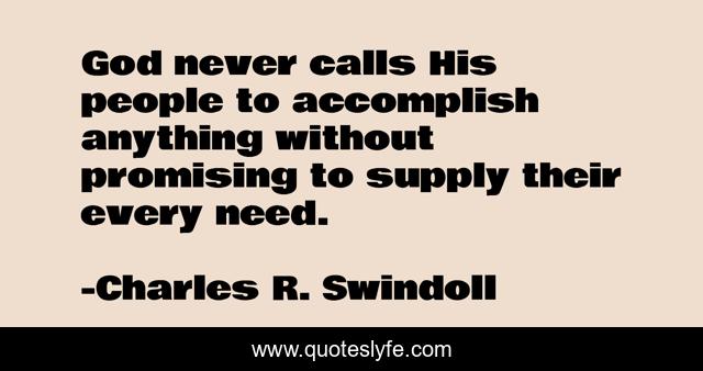 This page presents the quote "God never calls His people to accomplish anything without promising to supply their every need.". Author of this quote is Charles R. Swindoll. This quote is about faith, trust, god, providence,.