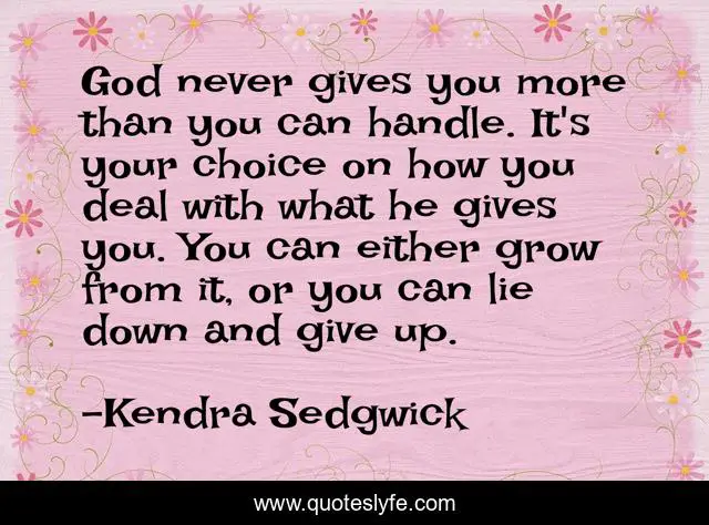 This page presents the quote "God never gives you more than you can handle. It's your choice on how you deal with what he gives you. You can either grow from it, or you can lie down and give up.". Author of this quote is Kendra Sedgwick. This quote is about god, choice, choices-and-consequences, inspirational, enthusiasm,.