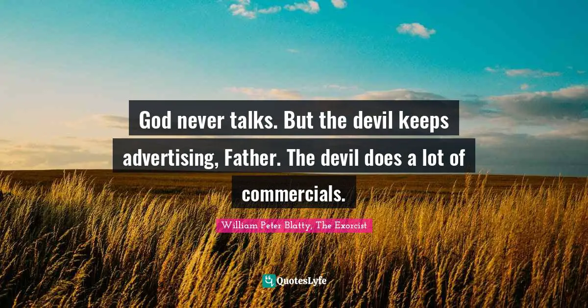 This page presents the quote "God never talks. But the devil keeps advertising, Father. The devil does a lot of commercials.". Author of this quote is William Peter Blatty, The Exorcist. This quote is about faith, evil,.