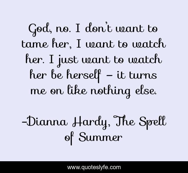 This page presents the quote "God, no. I don’t want to tame her, I want to watch her. I just want to watch her be herself – it turns me on like nothing else.". Author of this quote is Dianna Hardy, The Spell of Summer. This quote is about love, be-yourself, being-yourself, female-empowerment, unconditional-love, affection,.