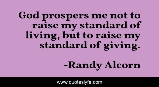 This page presents the quote "God prospers me not to raise my standard of living, but to raise my standard of giving.". Author of this quote is Randy Alcorn. This quote is about faith, sharing, giving, money, hoarding, stewardship, christianity, standard-of-living,.
