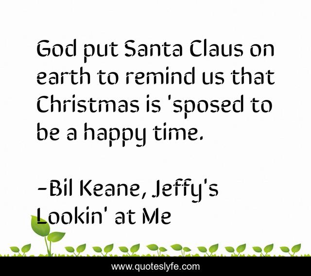 This page presents the quote "God put Santa Claus on earth to remind us that Christmas is 'sposed to be a happy time.". Author of this quote is Bil Keane, Jeffy's Lookin' at Me. This quote is about being-happy, enjoy-life, pursuit-of-happiness, jared-wheat, spirit-of-christmas, god-s-love, santa-claus, fulfillment, santa,.