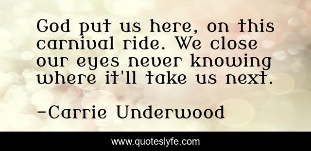 This page presents the quote "God put us here, on this carnival ride. We close our eyes never knowing where it'll take us next.". Author of this quote is Carrie Underwood. This quote is about god, life, roller-coaster, surprises,.