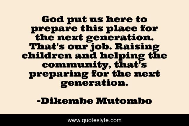 This page presents the quote "God put us here to prepare this place for the next generation. That's our job. Raising children and helping the community, that's preparing for the next generation.". Author of this quote is Dikembe Mutombo. This quote is about job, children, community,.