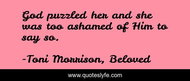 This page presents the quote "God puzzled her and she was too ashamed of Him to say so.". Author of this quote is Toni Morrison, Beloved. This quote is about mystery, god, shame,.