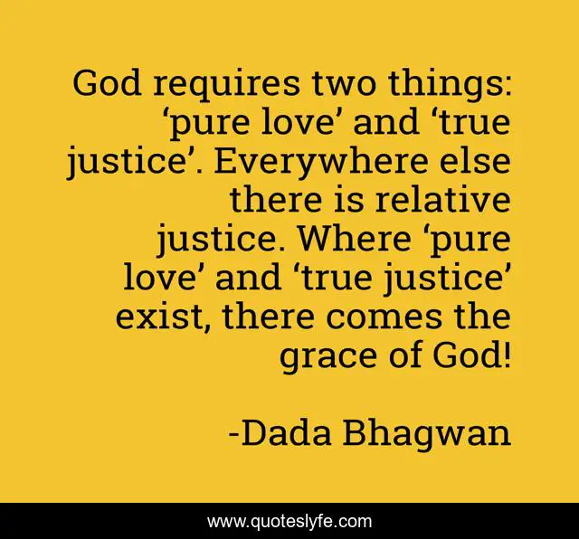 This page presents the quote "God requires two things: ‘pure love’ and ‘true justice’. Everywhere else there is relative justice. Where ‘pure love’ and ‘true justice’ exist, there comes the grace of God!". Author of this quote is Dada Bhagwan. This quote is about true-justice, god, spiritual, grace, pure-love,.