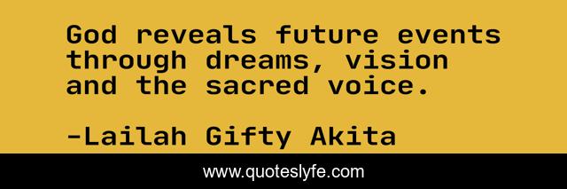 This page presents the quote "God reveals future events through dreams, vision and the sacred voice.". Author of this quote is Lailah Gifty Akita. This quote is about god, instincts, encouragement, possibilities, future, visions, dream,.