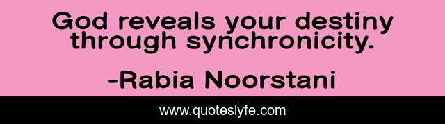 This page presents the quote "God reveals your destiny through synchronicity.". Author of this quote is Rabia Noorstani. This quote is about god, destiny, synchronicity,.