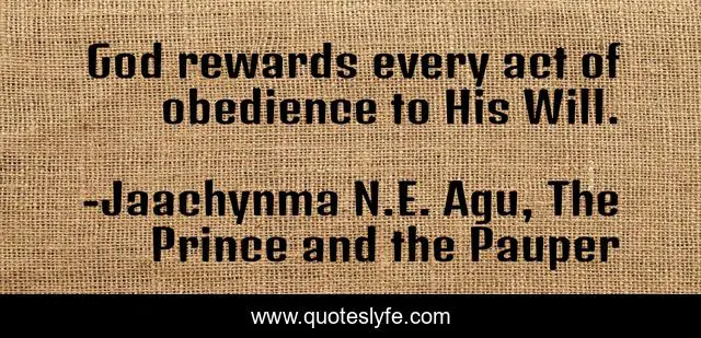 "Jaachynma N.E. Agu, The Prince and the Pauper Quotes." Quoteslyfe.com, 2025. Sat. 06 Dec. 2025. <https://www.quoteslyfe.com/quote/God-rewards-every-act-of-obedience-to-28833>.