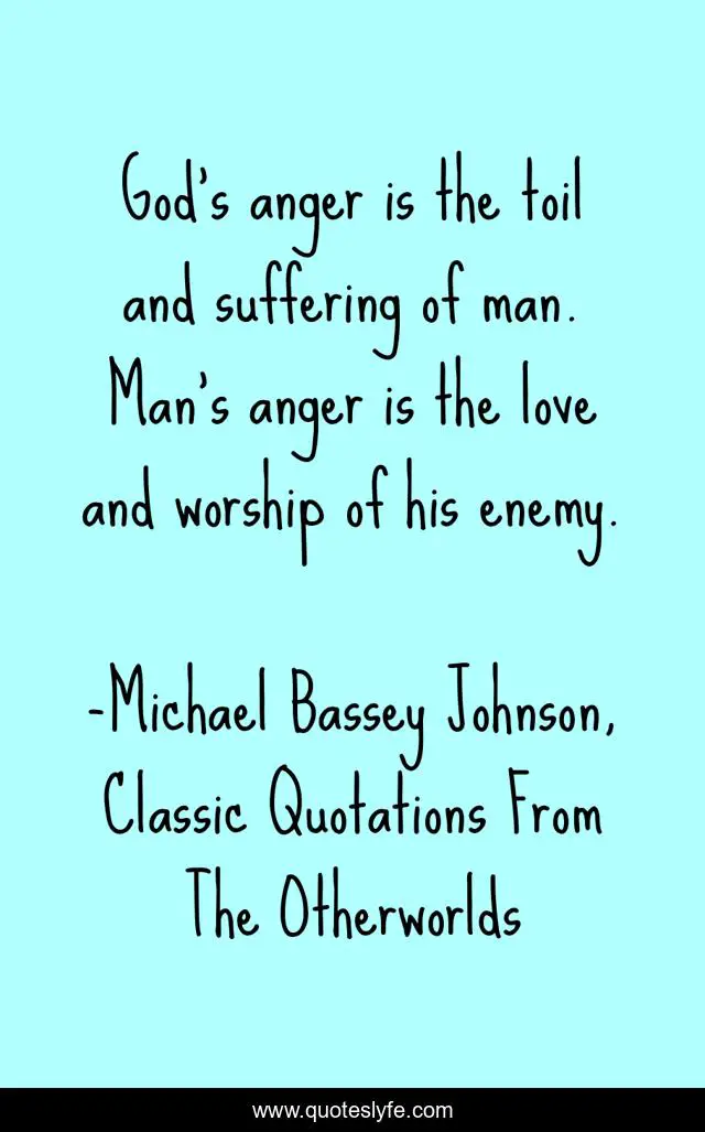 This page presents the quote "God's anger is the toil and suffering of man. Man's anger is the love and worship of his enemy.". Author of this quote is Michael Bassey Johnson, Classic Quotations From The Otherworlds. This quote is about enemy, love, war, god, revolt, rebellion, satan, rebel, anger,.
