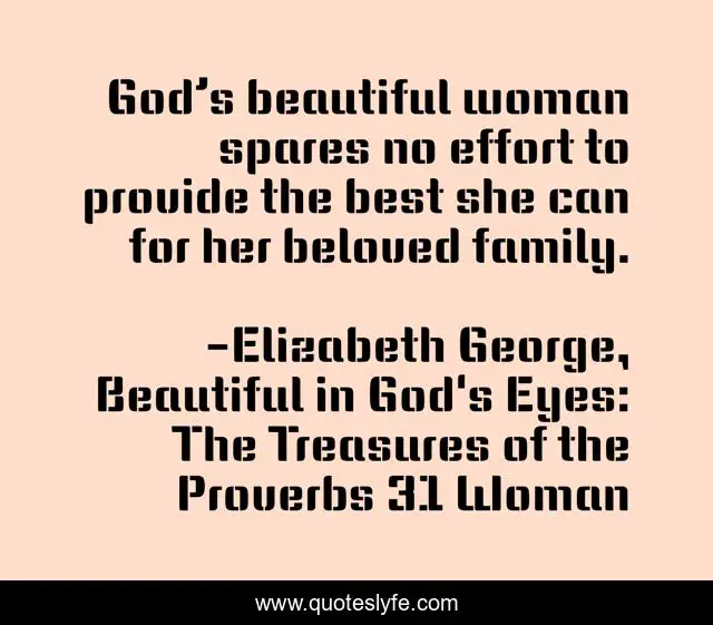 "Elizabeth George, Beautiful in God's Eyes: The Treasures of the Proverbs 31 Woman Quotes." Quoteslyfe.com, 2025. Sat. 06 Dec. 2025. <https://www.quoteslyfe.com/quote/God-s-beautiful-woman-spares-no-effort-86722>.