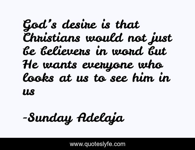 This page presents the quote "God’s desire is that Christians would not just be believers in word but He wants everyone who looks at us to see him in us". Author of this quote is Sunday Adelaja. This quote is about desire, everyone, word, believers, god, looks, christians,.