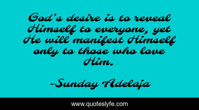 This page presents the quote "God’s desire is to reveal Himself to everyone, yet He will manifest Himself only to those who love Him.". Author of this quote is Sunday Adelaja. This quote is about desire, reveal, manifestation,.