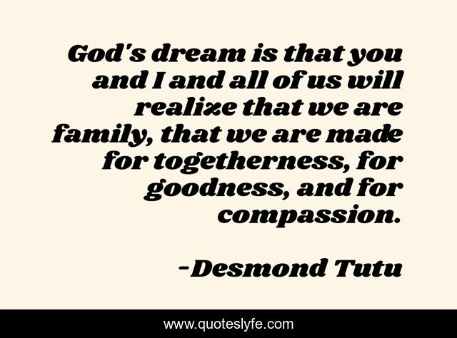 This page presents the quote "God's dream is that you and I and all of us will realize that we are family, that we are made for togetherness, for goodness, and for compassion.". Author of this quote is Desmond Tutu. This quote is about compassion, god, dream,.