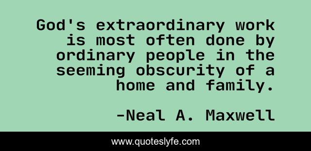 This page presents the quote "God's extraordinary work is most often done by ordinary people in the seeming obscurity of a home and family.". Author of this quote is Neal A. Maxwell. This quote is about enthusiasm, religious, inspirational,.
