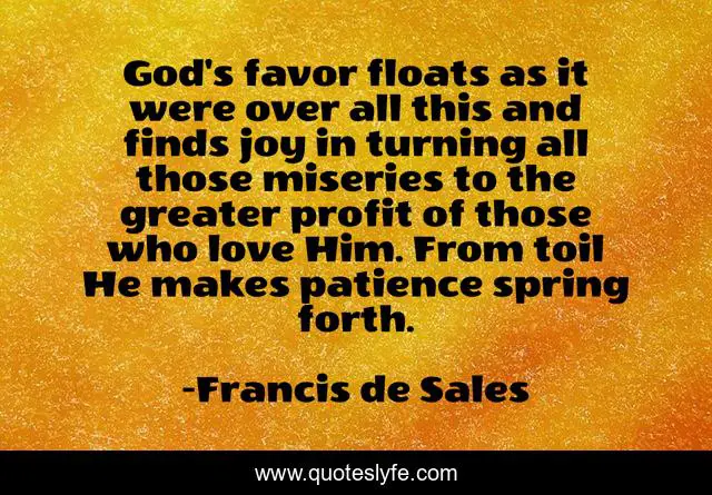 This page presents the quote "God's favor floats as it were over all this and finds joy in turning all those miseries to the greater profit of those who love Him. From toil He makes patience spring forth.". Author of this quote is Francis de Sales. .