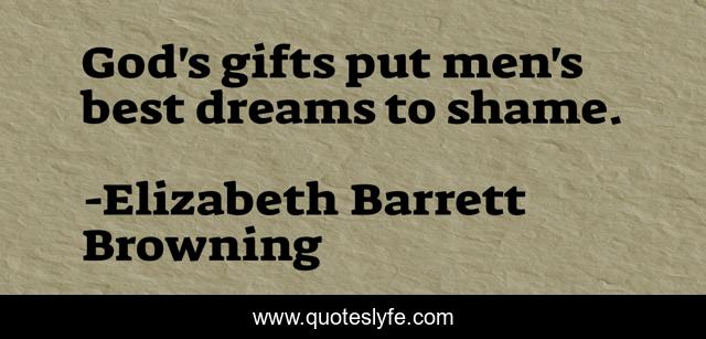 This page presents the quote "God's gifts put men's best dreams to shame.". Author of this quote is Elizabeth Barrett Browning. This quote is about religion, dreams,.