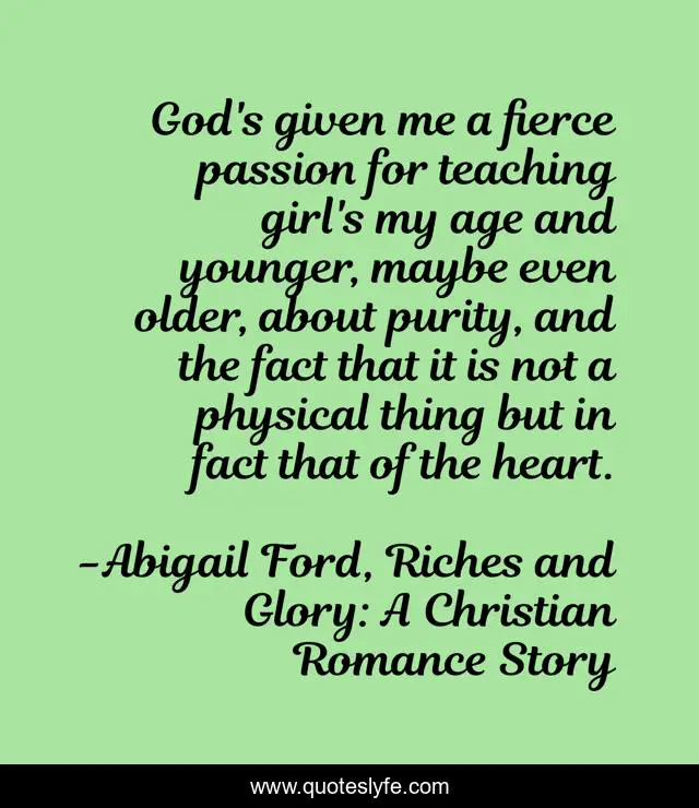 This page presents the quote "God's given me a fierce passion for teaching girl's my age and younger, maybe even older, about purity, and the fact that it is not a physical thing but in fact that of the heart.". Author of this quote is Abigail Ford, Riches and Glory: A Christian Romance Story. This quote is about true-romance, foreword, passion, purity, inspirational, enthusiasm, purity-of-heart,.