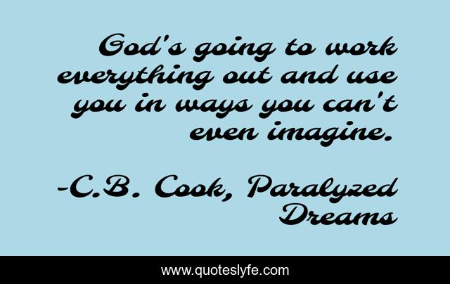 This page presents the quote "God's going to work everything out and use you in ways you can't even imagine.". Author of this quote is C.B. Cook, Paralyzed Dreams. This quote is about hard-times, faith, god, perseverance,.