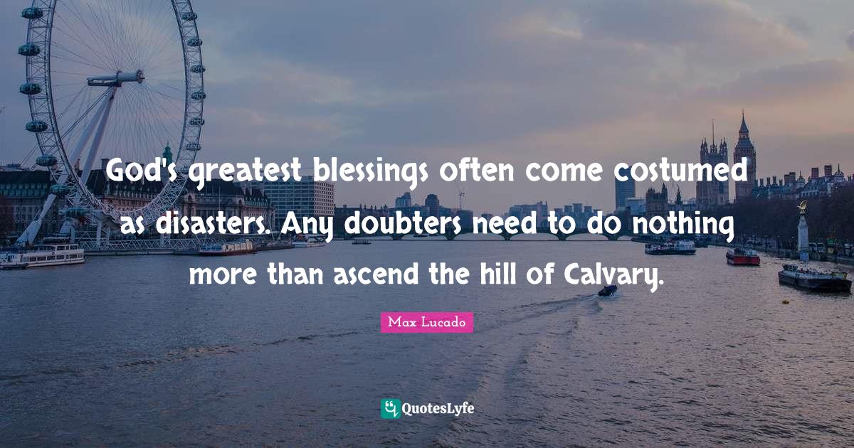 This page presents the quote "God's greatest blessings often come costumed as disasters. Any doubters need to do nothing more than ascend the hill of Calvary.". Author of this quote is Max Lucado. This quote is about christian, doubters, greatest blessings, god, calvary, religious,.