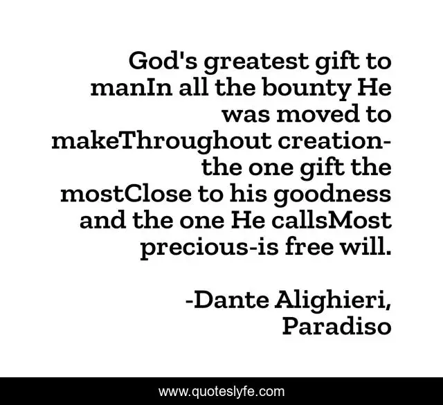 This page presents the quote "God's greatest gift to manIn all the bounty He was moved to makeThroughout creation-the one gift the mostClose to his goodness and the one He callsMost precious-is free will.". Author of this quote is Dante Alighieri, Paradiso. .