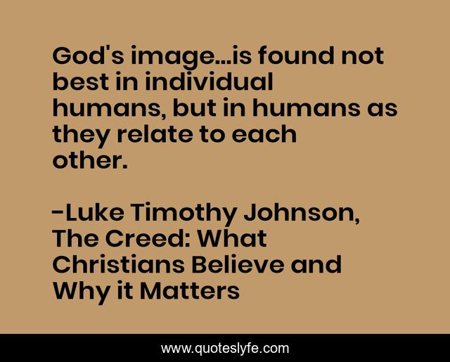 This page presents the quote "God's image…is found not best in individual humans, but in humans as they relate to each other.". Author of this quote is Luke Timothy Johnson, The Creed: What Christians Believe and Why it Matters. This quote is about god, image,.