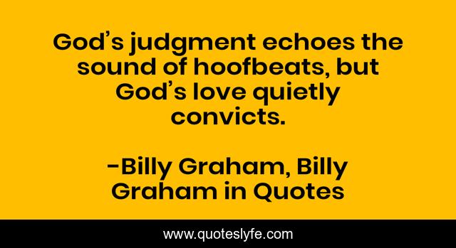 This page presents the quote "God’s judgment echoes the sound of hoofbeats, but God’s love quietly convicts.". Author of this quote is Billy Graham, Billy Graham in Quotes. This quote is about judgment, billy-graham,.