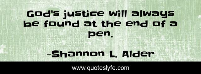This page presents the quote "God's justice will always be found at the end of a pen.". Author of this quote is Shannon L. Alder. This quote is about bible, novels, justice, writers, dancing-with-the-devil, books, authors,.