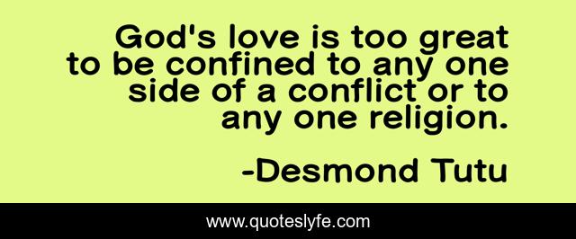 This page presents the quote "God's love is too great to be confined to any one side of a conflict or to any one religion.". Author of this quote is Desmond Tutu. This quote is about god, great, love, affection,.