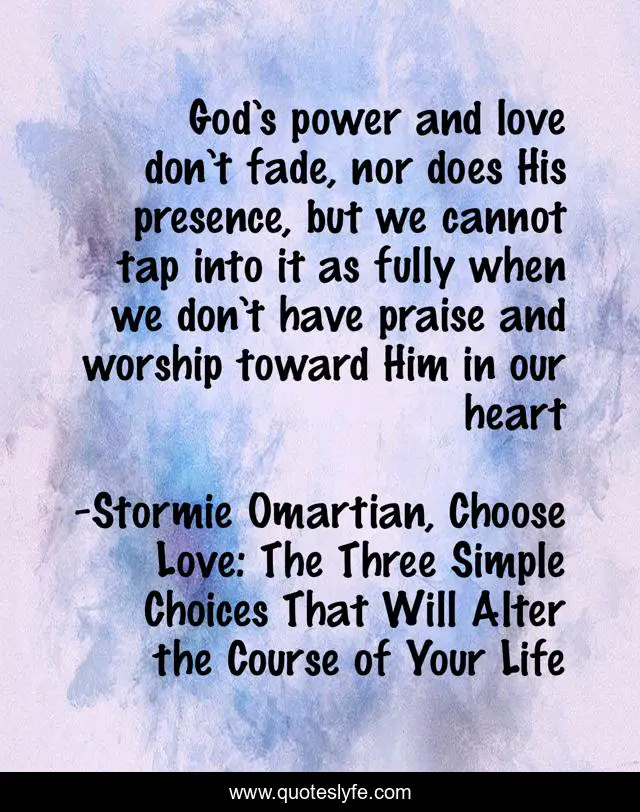 This page presents the quote "God’s power and love don’t fade, nor does His presence, but we cannot tap into it as fully when we don’t have praise and worship toward Him in our heart". Author of this quote is Stormie Omartian, Choose Love: The Three Simple Choices That Will Alter the Course of Your Life. This quote is about heart, love, power, presence, god, quotes, praise, worship, affection,.